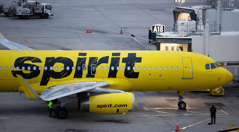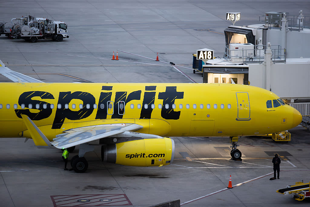 A Spirit Airlines plane is at George Bush Intercontinental Airport (IAH) in Houston, Texas, on Dec. 29, 2025.