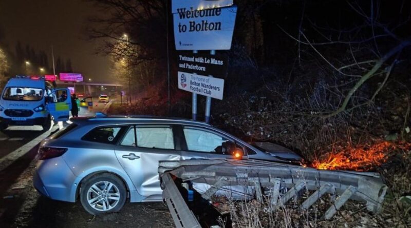 An image supplied by police at the scene shows a damaged car at the side of the motorway beneath a sign that reads “Welcome to Bolton”.