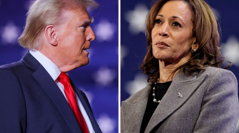 Republican presidential nominee and former U.S. President Donald Trump holds a campaign rally at Macomb Community College in Warren, Michigan, U.S., November 1, 2024 (L), and Democratic presidential nominee U.S. Vice President Kamala Harris speaks during a campaign event in Atlanta, Georgia, U.S., October 19, 2024.