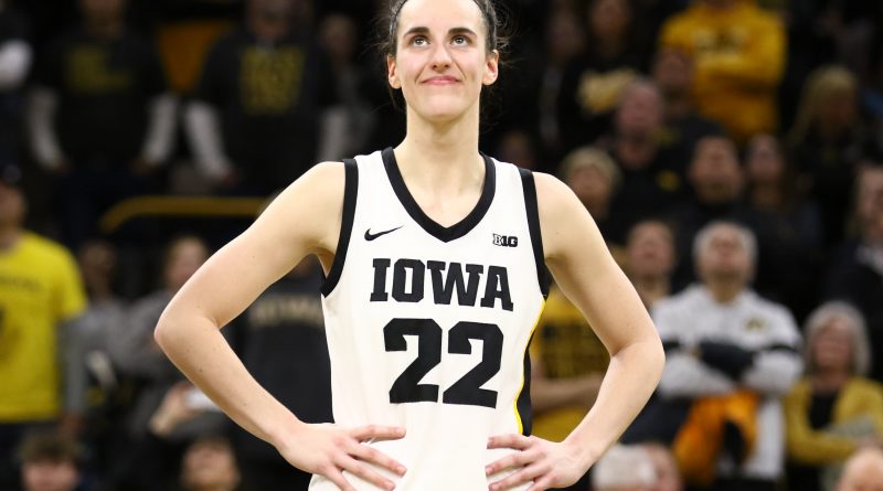 Guard Caitlin Clark #22 of the Iowa Hawkeyes listens as the crowd cheers after breaking the NCAA women’s all-time scoring record during the game against the Michigan Wolverines at Carver-Hawkeye Arena on February 15, 2024 in Iowa City, Iowa.