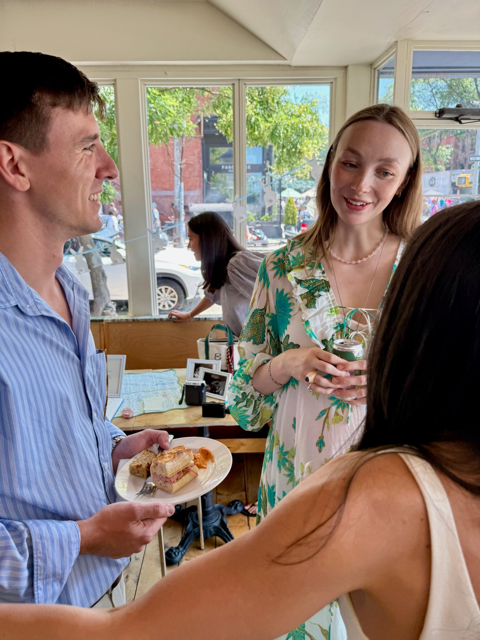 Sandwiches, pastries, and grocery-store sheet cake (from Wegmans! so good!) ran down the bar, and we drank iced coffees. A two-tiered cake stand offered up their favorite cookies from childhood: monster cookies for Erika, and linzer tarts for Christian. White balloons bopped against the ceiling, and the couple’s own baby photos stood framed on the tables.