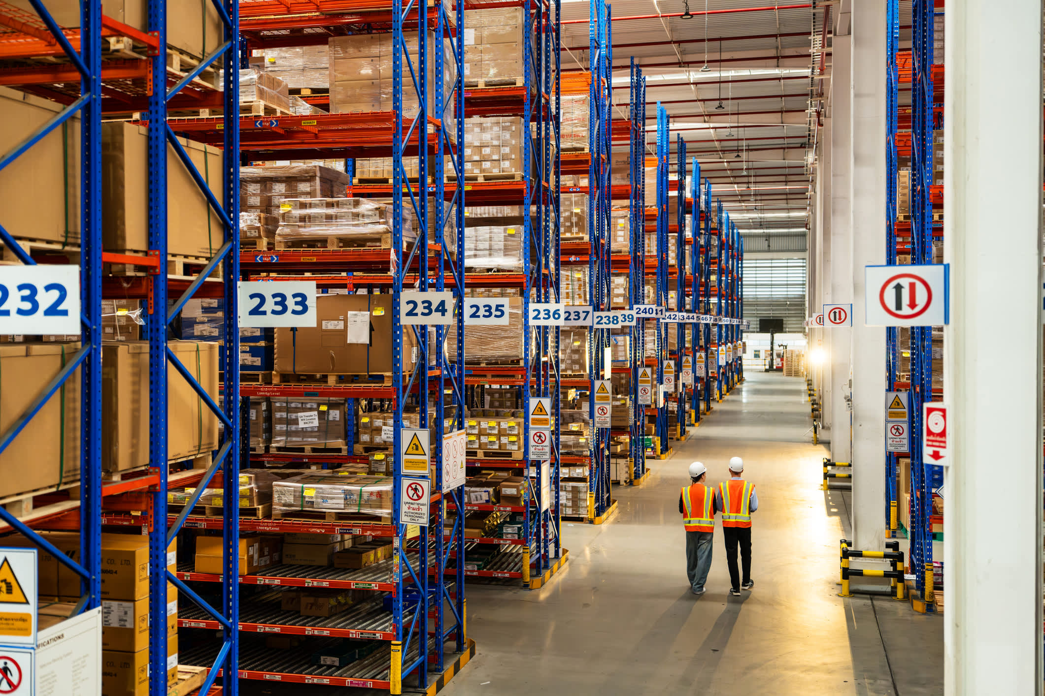 A large industrial warehouse features rows of shelves stacked with packages, while two workers in safety gear are walking and inspecting the storage. Utilized space exemplifies efficiency and systematic inventory management.