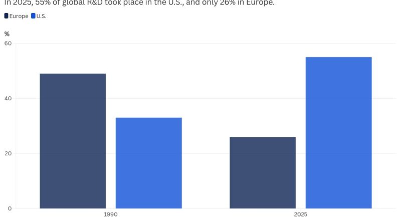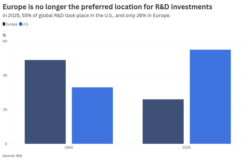 For decades, Europe was the world’s undisputed laboratory. In 1990, nearly half of global research and development took place in Europe, and about a third in the U.S., according to research by ING. Today, the U.S. share of R&D has jumped to 55%, while Europe’s has plummeted to 26%.