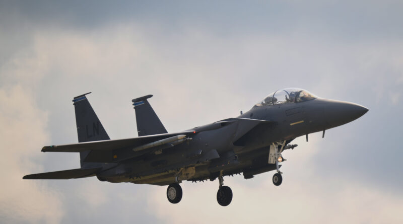 A USAF McDonnell Douglas F-15E Strike Eagle lands at RAF Lakenheath on July 22, 2025, in Lakenheath, United Kingdom.