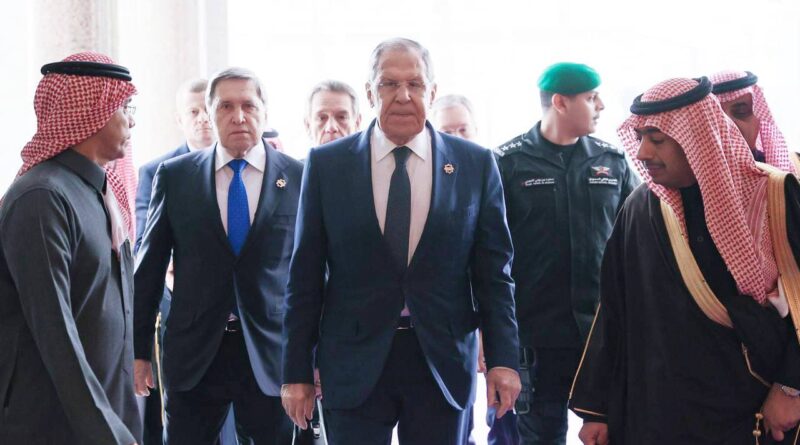 Russian Foreign Minister Sergey Lavrov (C) and Russian President Vladimir Putin’s Foreign Policy Advisor Yuri Ushakov (2nd L) arrive for a meeting between Russia and the United States aimed at improving relations between the two nations and addressing the conflict in Ukraine, in Riyadh, Saudi Arabia, on 18 February 2025.