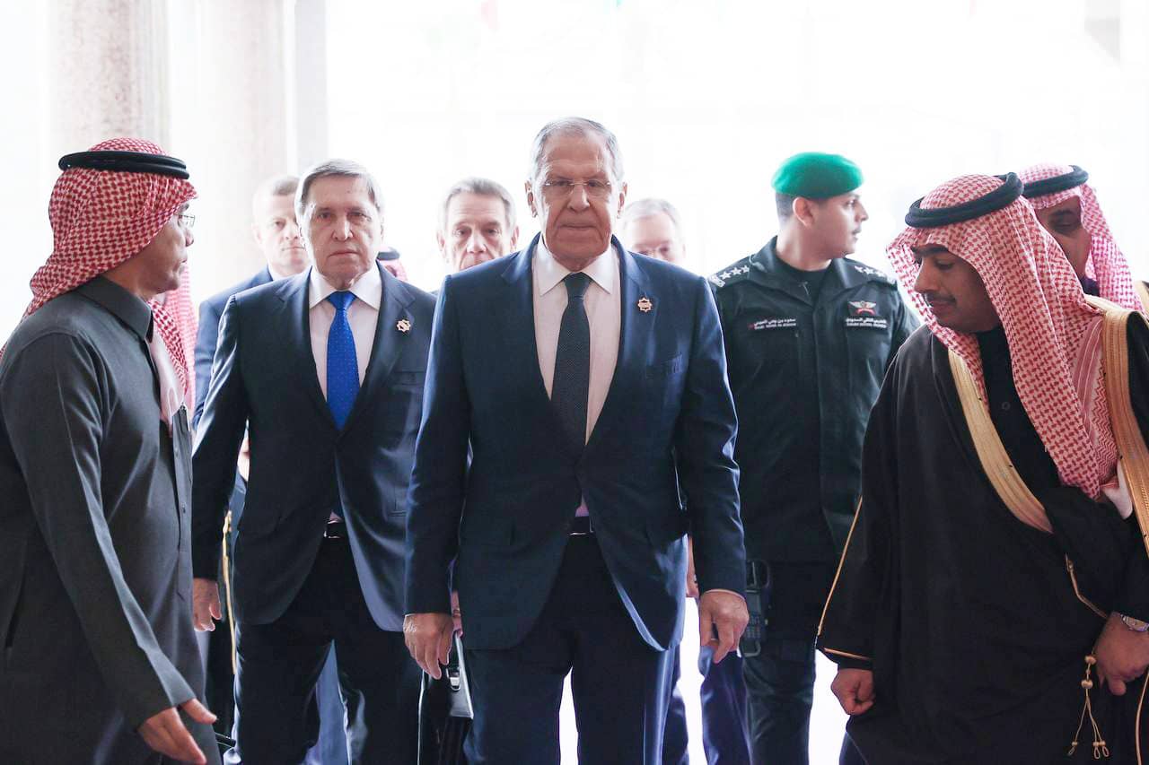 Russian Foreign Minister Sergey Lavrov (C) and Russian President Vladimir Putin’s Foreign Policy Advisor Yuri Ushakov (2nd L) arrive for a meeting between Russia and the United States aimed at improving relations between the two nations and addressing the conflict in Ukraine, in Riyadh, Saudi Arabia, on 18 February 2025.
