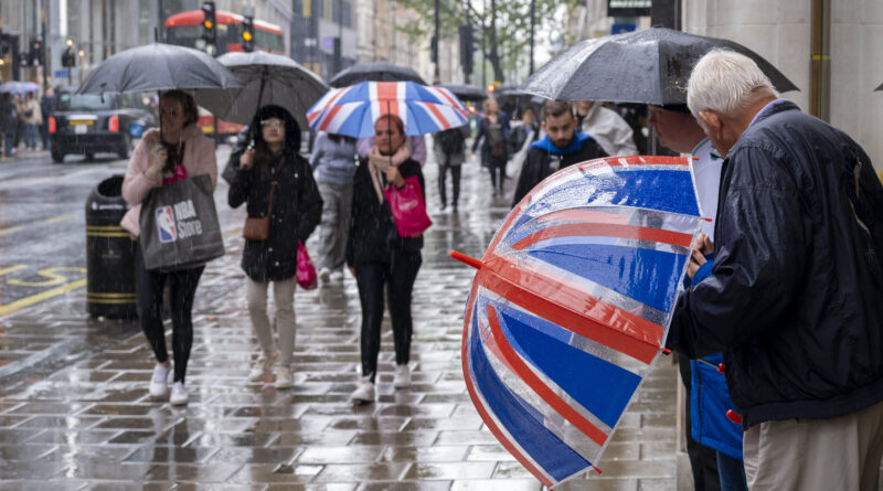 Shoppers and visitors on London’s Oxford Street brave the bad weather using Union Flag umbrellas on 6th May 2024.