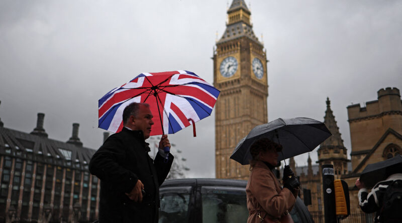 Pedestrians shelter from the rain under umbrellas as they pass the Elizabeth Tower, commonly known by the name of the clock’s bell, Big Ben, at the Palace of Westminster, home to the Houses of Parliament, in London on Feb. 22, 2024.