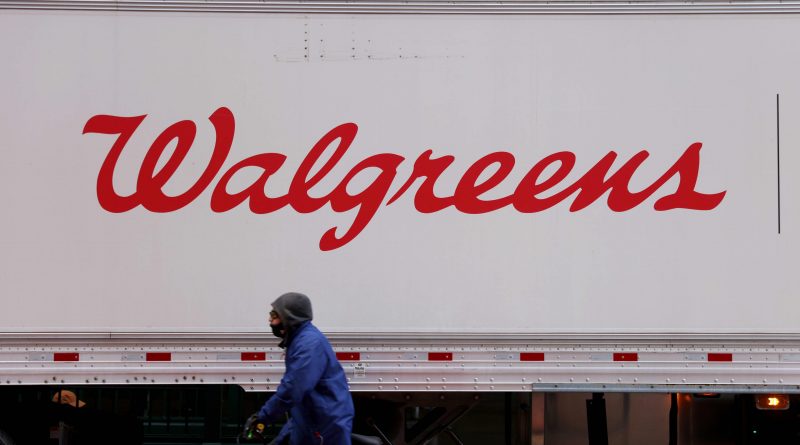 A person rides past a Walgreens truck, owned by the Walgreens Boots Alliance, Inc., in Manhattan, New York City, U.S., November 26, 2021.