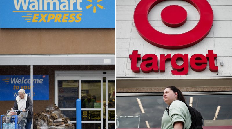 A customer pushes a shopping cart full of groceries outside a Wal-Mart in Rogers, Arkansas, left, and a pedestrian passes a Target store in the Tenleytown neighborhood of Washington, D.C.