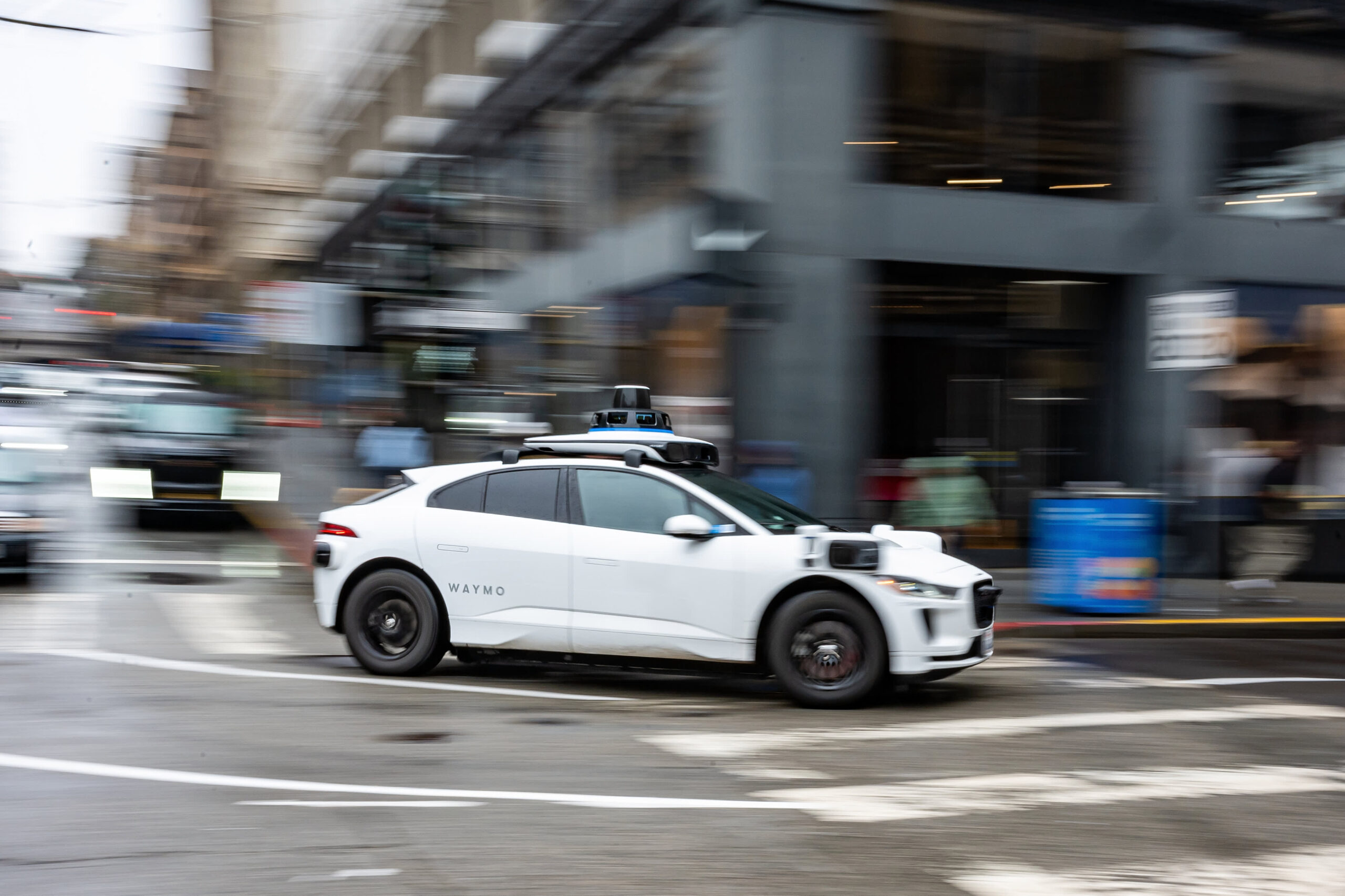 Waymo autonomous taxis turns onto Post Street in San Francisco, California, US, on Wednesday, Dec. 17, 2025.