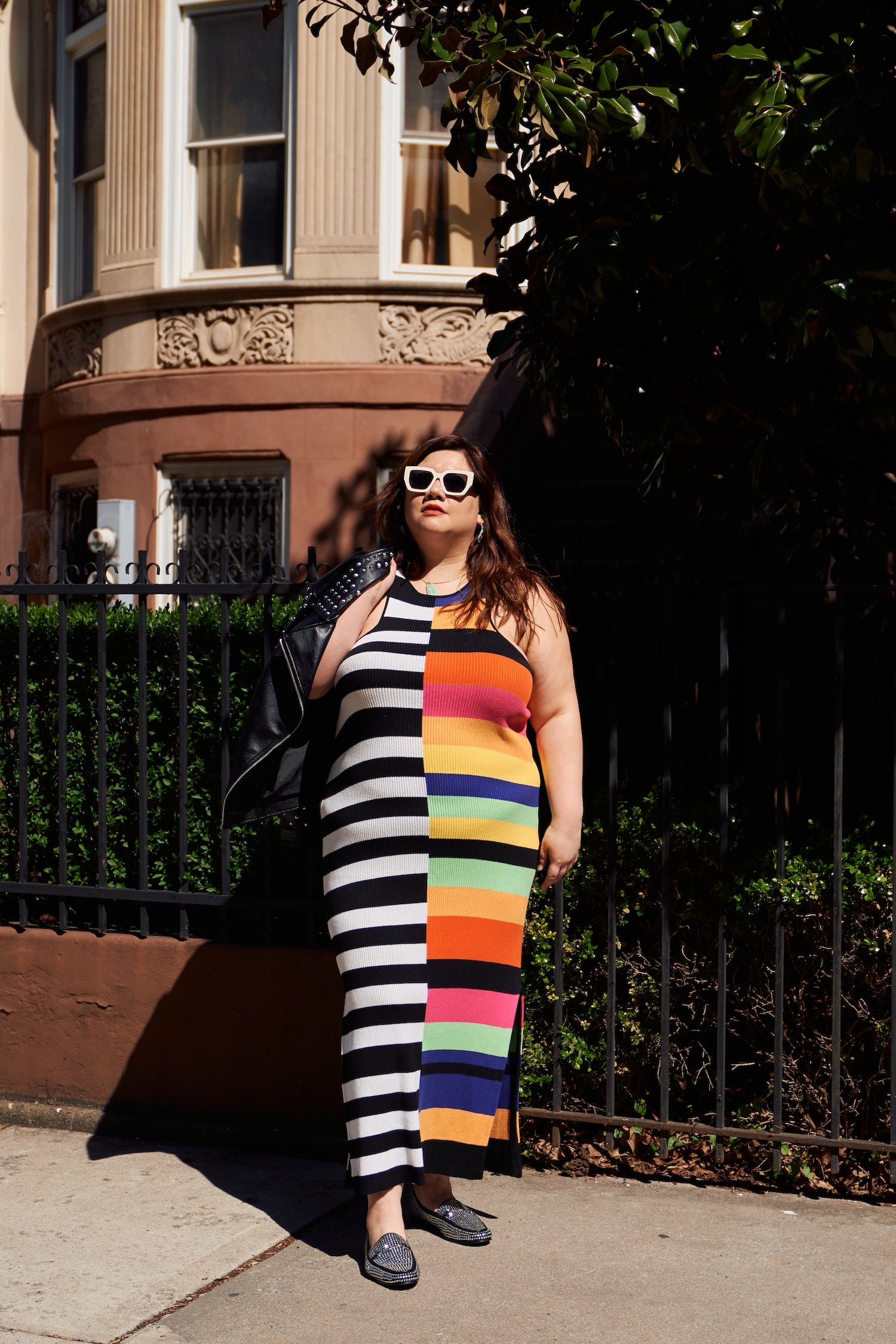 Dress: Eloquii. Jacket: Forever 21, similar. Shoes: Sam Edelman. Sunglasses: Free People.