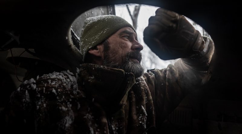 A Ukrainian soldier is seen inside an artillery vehicle in his fighting position as Russia-Ukraine war continues in the direction of Kharkiv, Ukraine on November 20, 2023.