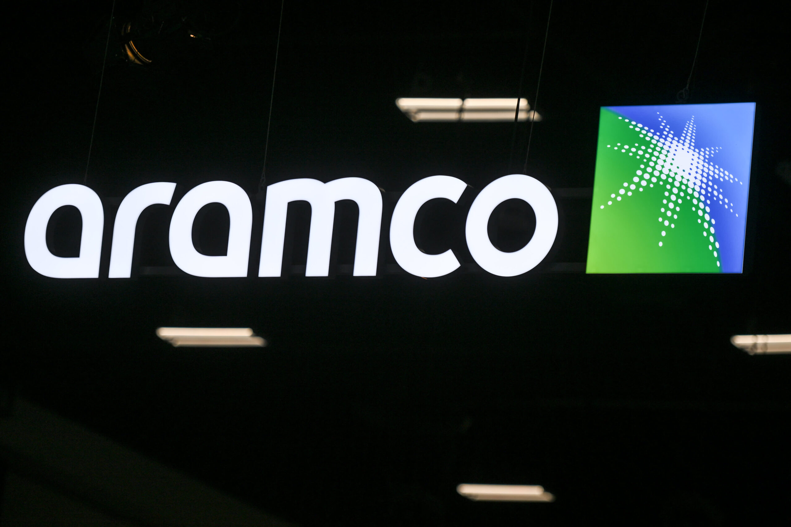 Logo of Aramco, officially the Saudi Arabian Oil Group, Saudi petroleum and natural gas company, seen on the second day of the 24th World Petroleum Congress at the Big 4 Building at Stampede Park, on September 18, 2023, in Calgary, Canada.